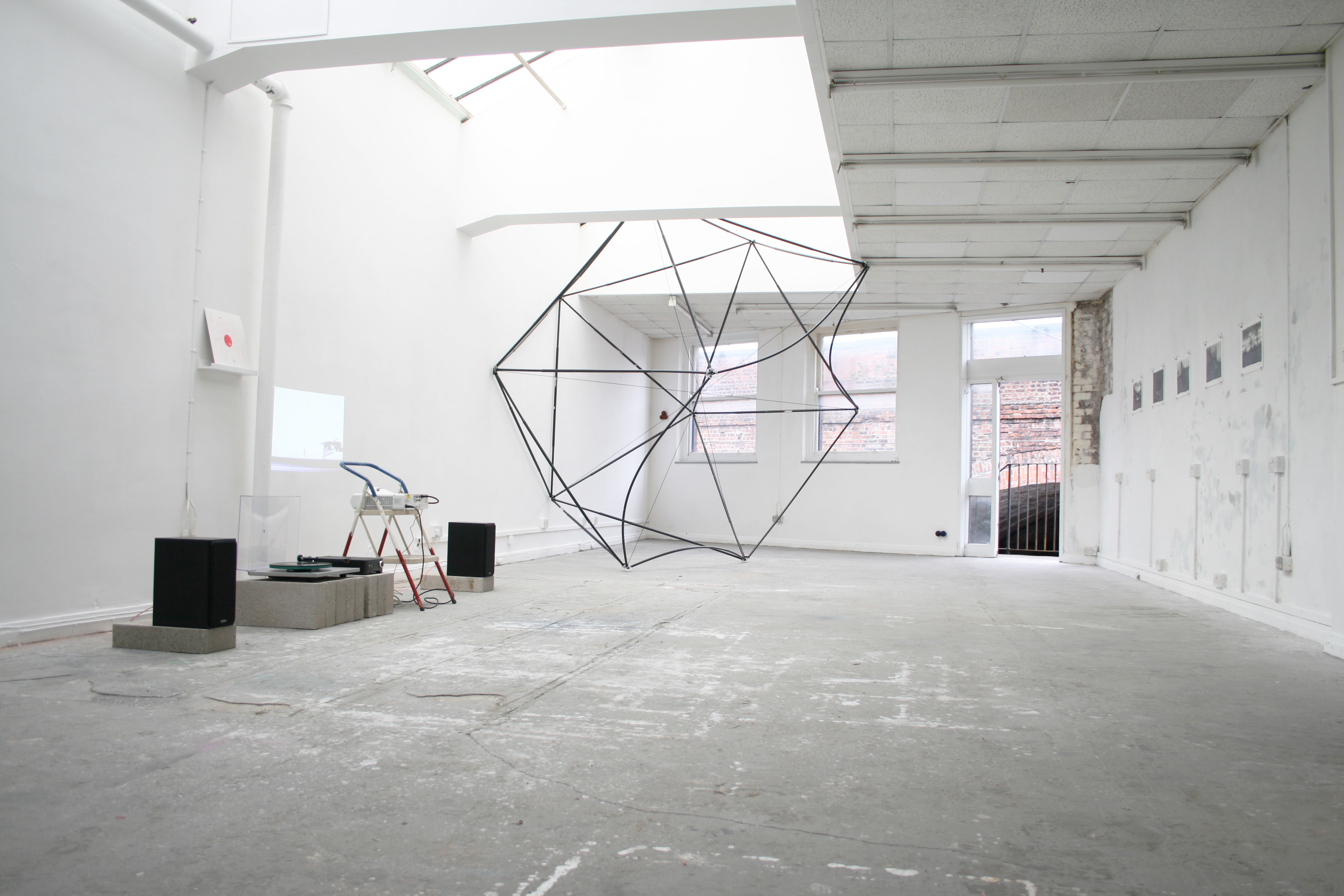 So it is adaptation that pervaded not just the location of the excellent studio of Depot, but the work itself: Adam Glatherine’s ‘Plato’s Inverted Sukkah’ (2018) is a hollow icosahedron (apologies, Adam, if that is not the correct Platonic Solid) suspended beneath a skylight — too large to be removed from the studio without careful deconstruction. A Sukkah is a temporary shelter, one built in the Jewish festival of Sukkot to commemorate the benefaction of God when the Jews fled Egypt into the wilderness. Glatherine’s installation is imposing but sparse, as if drawn freehand into three-dimensional space, and held tentatively by the weave of the air. The low ceiling of the studio prohibited the use of a stepladder to suspend the piece, so the stepladder appears as homage elsewhere, to support the projector for ‘Breaking the Sound Barrier 8’ (2012), by Alan Dunn, Martyn Rainford, Jack Wolff and Laure Ferraris. The piece is an audio work that began life as the sonic-foetus of Rainford. It has since been remixed several times in a programme of exchange and contamination and the result is a pastry of harmony, atonality, and spoken word, as if the top-to-tail conversation between all of these artists has been folded in concertina, rounded, grooved, sleeved, pretensions sanded away, and presented as a simple reaction to the occasion which preceded it.