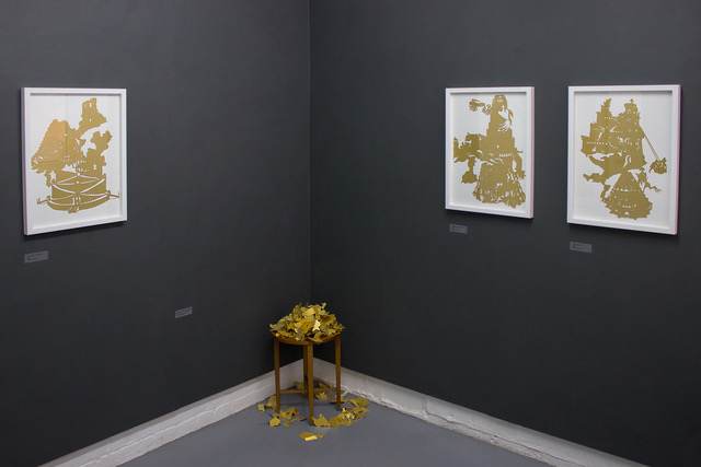 In the small space of the gallery bell jars and framed pieces are disrupted by the piling up of sculptural versions of the same forms emerging from a heap in the corner. There is a movement here in the use of paper as a material that interrogates the subject through variations on the practice. Intricate paper cuts on the walls, bell jars containing the gold paper pinned in a state of collapse; folded sculptural forms evolved further, yet displayed as though discarded.