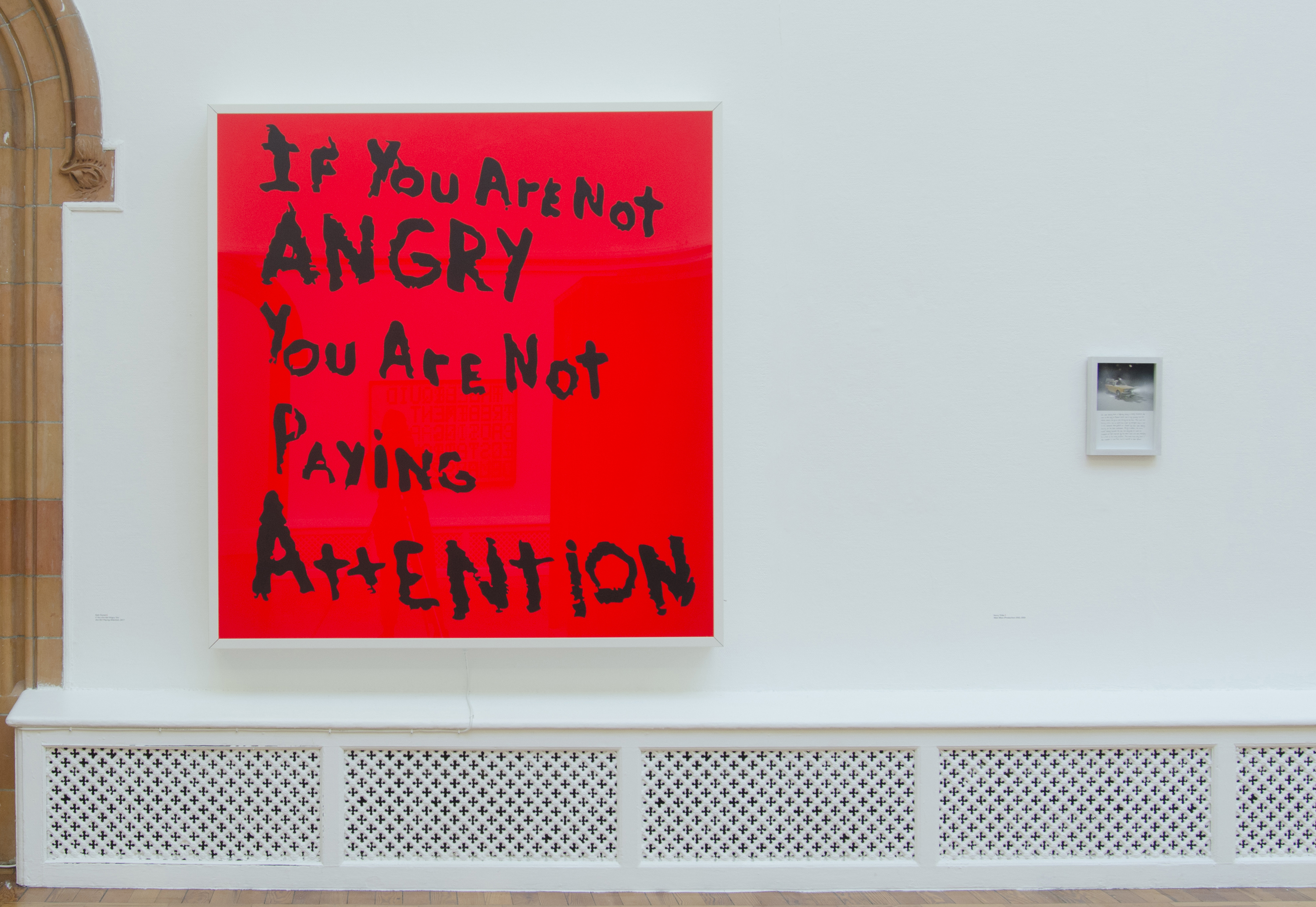 Sam Durant’s ‘Forwards Not Backwards’ (2017) and ‘If You Are Not Angry You Are Not Paying Attention’ (2017) present handwritten texts (sourced by Durant online) derived from political placards and re-contextualised on vibrant single-coloured backgrounds in two metre square light boxes. Durant takes personal statements of protest and filters them through the visual language of corporate advertising; the words take on an impersonal, official air, suggesting to the viewer how visual languages we assume belong to these different spheres are open to strategic appropriation.