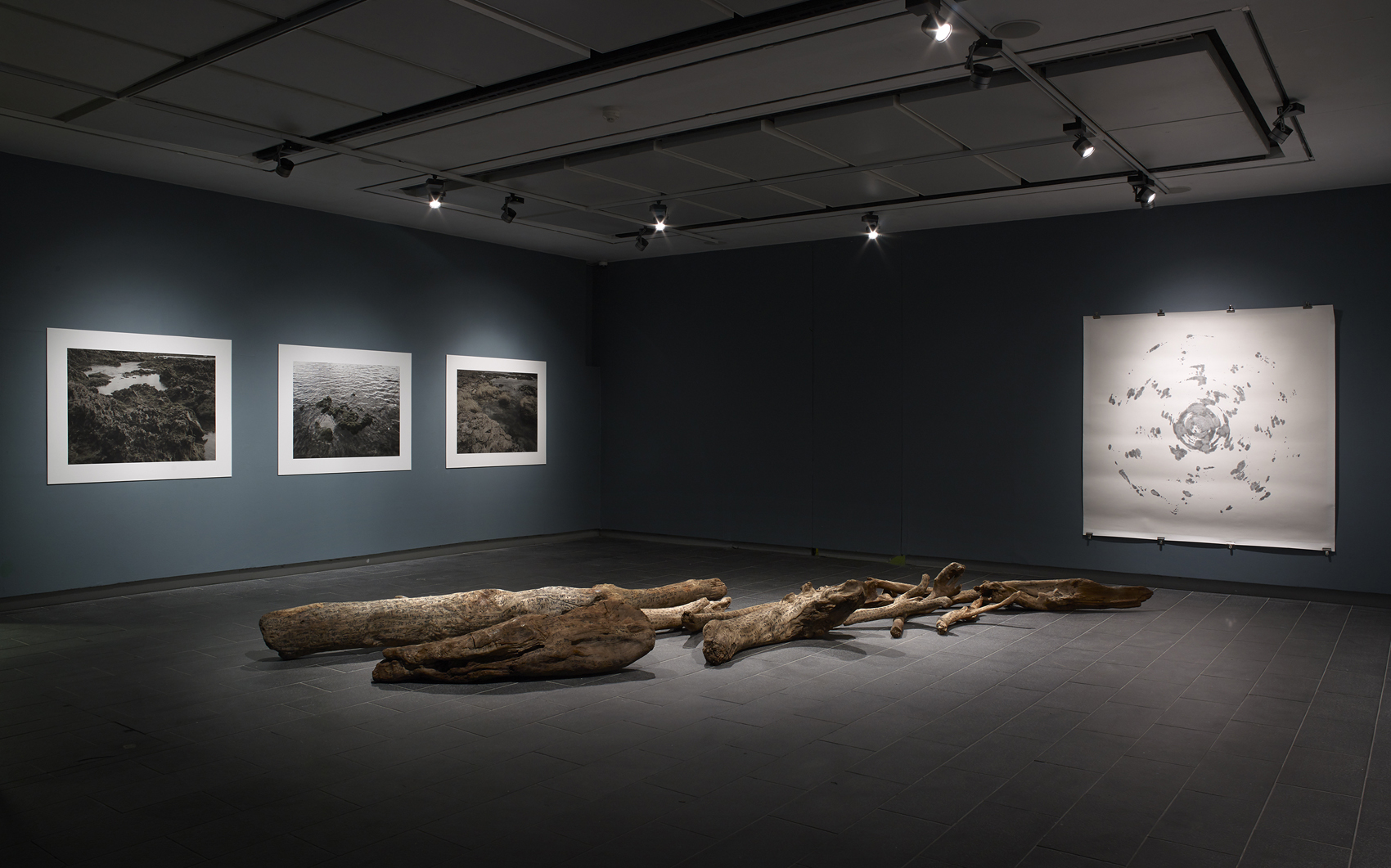 ‘Driftwood’ is the first piece you encounter within the exhibition and is the most visually impactive. The installation consists of large driftwood pieces inscribed with text from the Heart Sutra. The piece reminds us of both the destructive nature of the sea but also the regeneration that comes with it; reflected in the Taiwanese use of this natural resource within their buildings. The piece perfectly illustrates the concept of the Heart Sutra in its basic form, in which the natural flow of the universe constantly changes and with it our constant adaptation in reaction; the text inscription reflects this, as it is destined to fade and wear over time in a natural decay, further solidifying ideas of impermanence and transformation. This theme is continued with the adjacent piece ‘We Came From Nothingness’ (2014). These large watercolour pieces also contain the Heart Sutra text that disperses outwards in a circular motion, like the tidal waves and motion of a typhoon, depicting the universe’s natural state of flux.