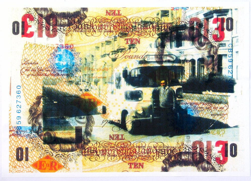 ‘Me Dad in Front of His Van, 38 Hertford Road, Bootle, Merseyside, 1960s’ (2019) is a photograph of the artist’s father and his ice cream van overlaid with a series of enlarged £10 notes. She uses the same technique with a portrait of her mother in ‘Late Mommy Ji’ (2019). The additions reflect an unsentimental stance that grounds the image as something more complex and full, acknowledging the role money plays in family dynamics. ‘Social reality’ here is not unmediated, as in documentary-style social realism, but a process of mediation through layering.