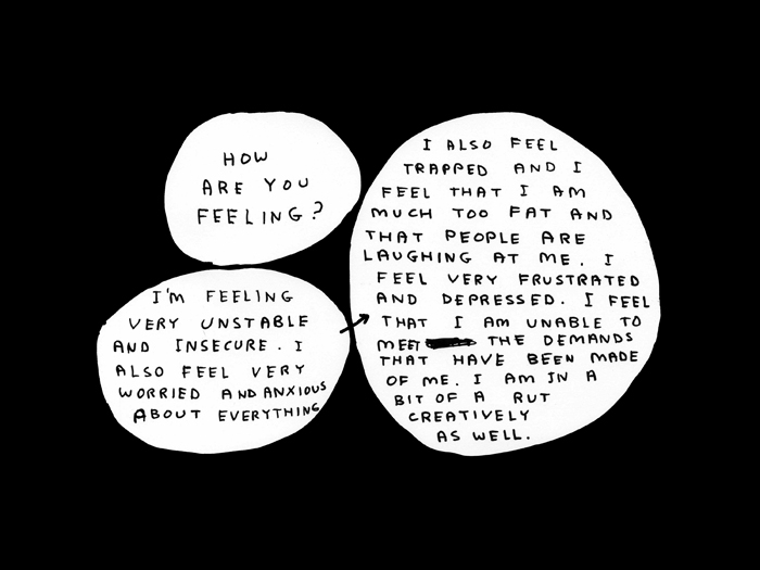 DS: Yes. The proposition for the show originally was that it would be participatory so that the audience could participate in the work and I suppose that’s the therapeutic aspect to it. Also the book is called How Are You Feeling? and the remit for that was that it’s a self-help book and about some kind of psychological therapy. It’s purported to be a self-help book but it isn’t much help on that level and even if it was I’m not qualified to write it. If it’s a critique of anything it’s perhaps a critique of the fact that there’s too many of these books exist and their only raison d’être is to make another self-help book – not really to help anybody.