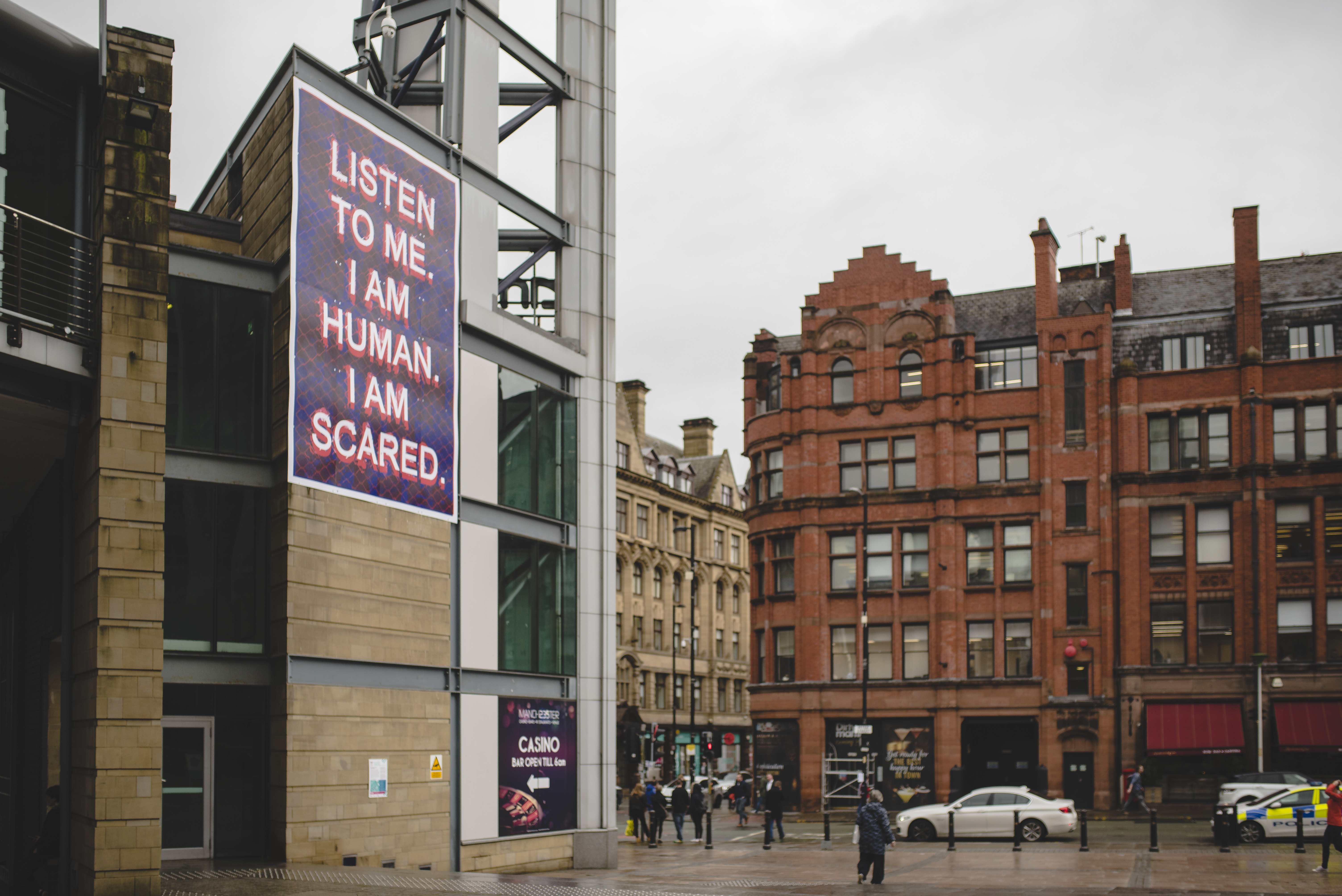 The work of Turner Prize nominee Mark Titchner, Look Up, created alongside Manchester-based group United for Change comprises of a series of large scale text-based works displayed on prominent buildings across Manchester city centre such as the National Football Museum and People’s History Museum. Working with refugees and asylum seekers in a variety of workshops facilitated by the charity Pathway Arts to produce the works, Titchner has created bold, striking pieces that simultaneously demands attention, yet look at home within the screen and poster-populated city centre. As a series of works that are text-based, utilising a bold type face and short, direct sentences, Titchner’s pieces share characteristics with the attention-demanding style of newspaper headlines, which appears emphasised by the crossed wire pattern seen in the background of the works bearing resemblance to the headline placards seen outside news agent shops.