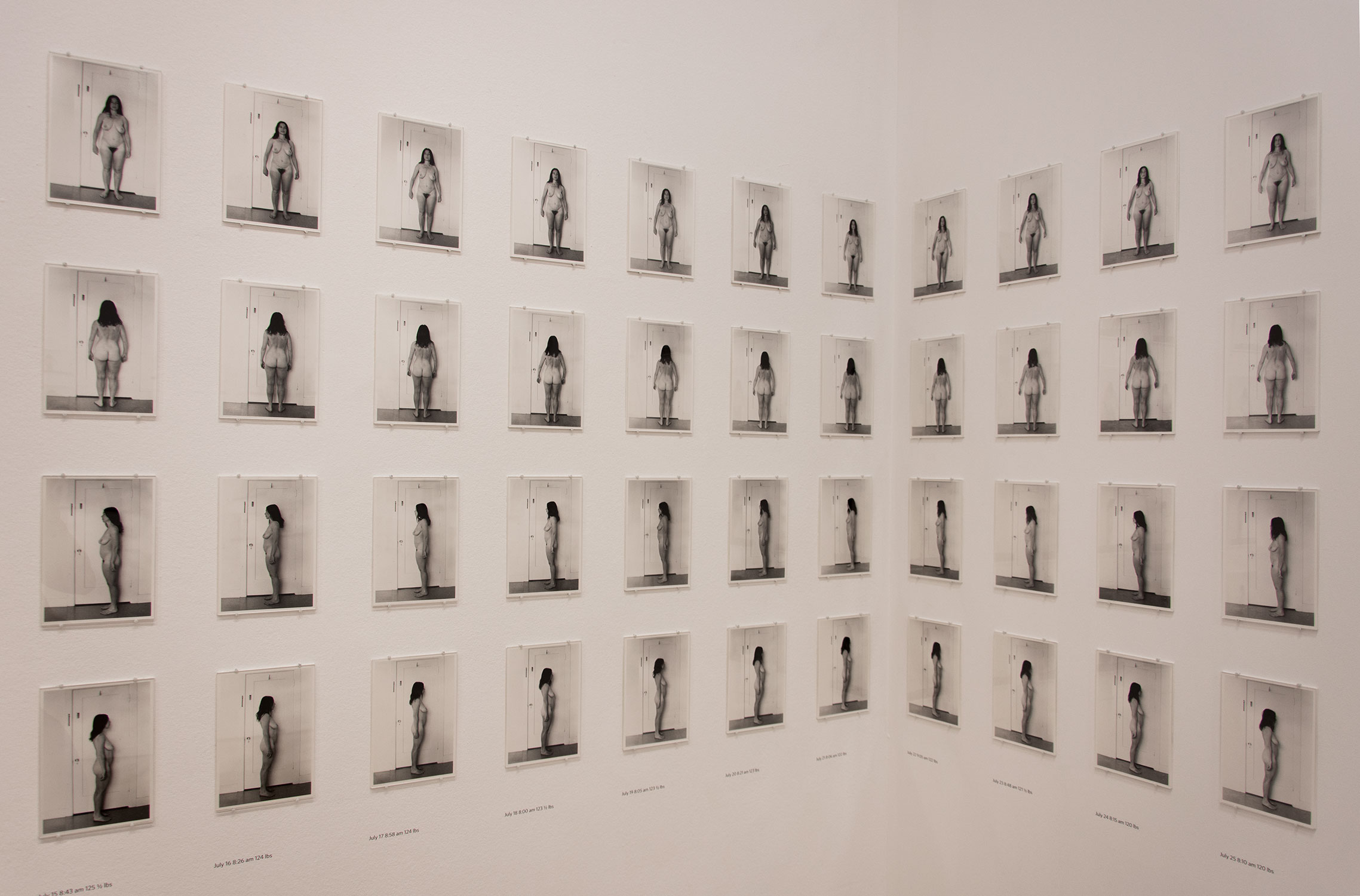 The works are precisely placed in rows and columns according to the stage of the Body’s ‘Carving’ process. Each individual print represents one day and the viewer witnesses the body decrease in weight due to dietary changes. This ritualistic documentation is displayed even more mathematically due to the fact that the weight of the artist at each point in the process is documented by text on the wall accordingly. Throughout the whole series of prints the viewer witnesses the artist losing just under ten pounds. With this intimate window into the artist’s body in the space comes a heightened awareness of the viewer and their behaviour. The inclination to keep checking the various weights against the relevant prints in comparison to the others is overwhelmingly satisfying. There is something about the order and routine that appeals to the human instinct. However, what is strange is that the space evokes an element of surveillance, both in regards to the work itself and the way it is viewed. Whilst screening the images routinely there becomes a paranoia of how long you should be looking at each piece, how long you spend in the space interrogating this stranger’s body and monitoring their weight loss. The viewer almost takes on a ritualistic approach to the work, trying to spend time equally on each print and search for the exact details.