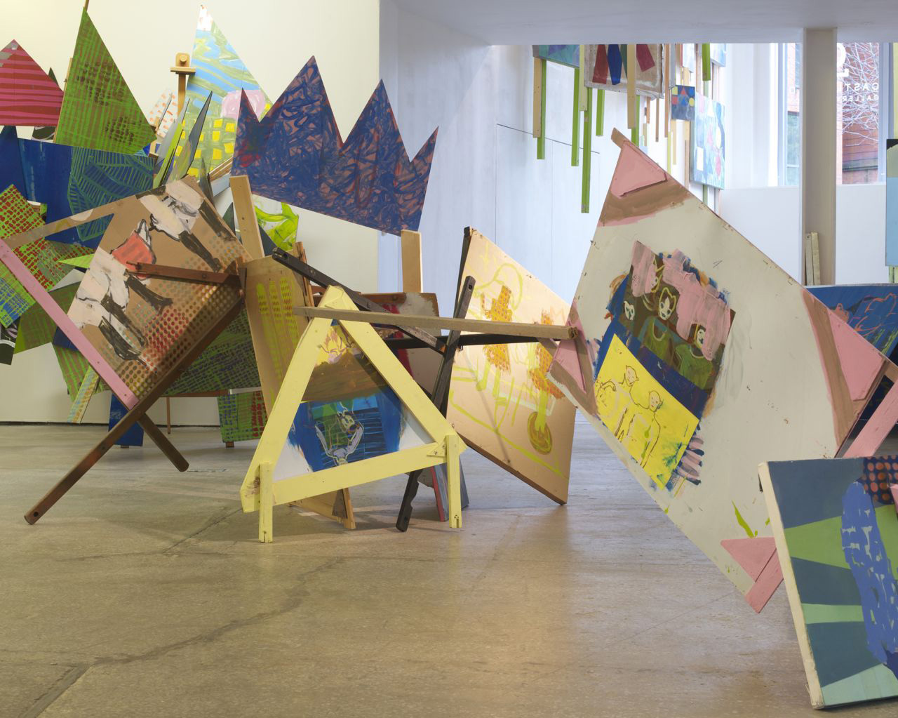Darren Nixon uses the materials and tools of paint to question the function of painting and its relation to other media, incorporating strategies from other practices. On entering the exhibition what first strikes viewers is the arrangement of the paintings. These are arranged as physical structures which can be navigated rather than hanging on the gallery walls. Throughout the duration of the exhibition Nixon reconfigures and reconstructs the existing artwork, creating it to be in a constant state of flux, which consequently allows the work to operate in different states of existence with no definite stage of completion. Nixon works with the potential of painting to explore definitions and ideas, and is interested in ‘what painting does and doesn’t do’. The paintings act as a construction of thinking rather than as a vehicle to communicate a set of ideals or messages. He opens up a debate on not only how people view painting, but how it relates to other media, highlighting both painting’s strengths and limitations.