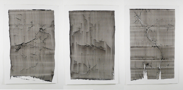 Maurice Carlin’s current exhibition First…Next…Then…Finally… at Castlefield Gallery celebrates the ‘corruption’, the collapse and the fusion of boundaries – the boundaries between the visual and the sculptural, the digital and the material, the random and the mystical. This rearrangement is achieved through tactical interventions on paper, city-scape and mundane material. By spreading colourful inks above sheets of street-based cards, Carlin’s work assembles a psychedelic map of surfaces – a tapestry of paintings that look like x-rays of groundness. Evoking the three-dimensional landscapes of digital worlds – the abstractness of these street-portraits is simultaneously a trace and a recreation of the physical space. Here comes a form of monument that re-produces the face of a street by dissolving its trace into colour – an ethereal signature of materiality. Converging thus the visual with the sculptural, Corrupted Images develop a geography of unstable signs, a palimpsests of impressions. Based on the unfixed symbols of fixed spaces, this dizzy vocabulary transforms the texture of the streets into encrypted dance-floor of fractals. The virtual seems to be happily superimposed upon the material. The curatorial style of demonstration, in setting side by side the video-recorded process of production and the finished piece, highlights the playful combination of randomness and control, handiness and spontaneity, simplicity and miracle. Under these terms, the act of painting becomes an impressionistic and instantaneous inversion of routinized space, one that invites the spectator/walker to sink his/her feet within a psychogeography of colour.
