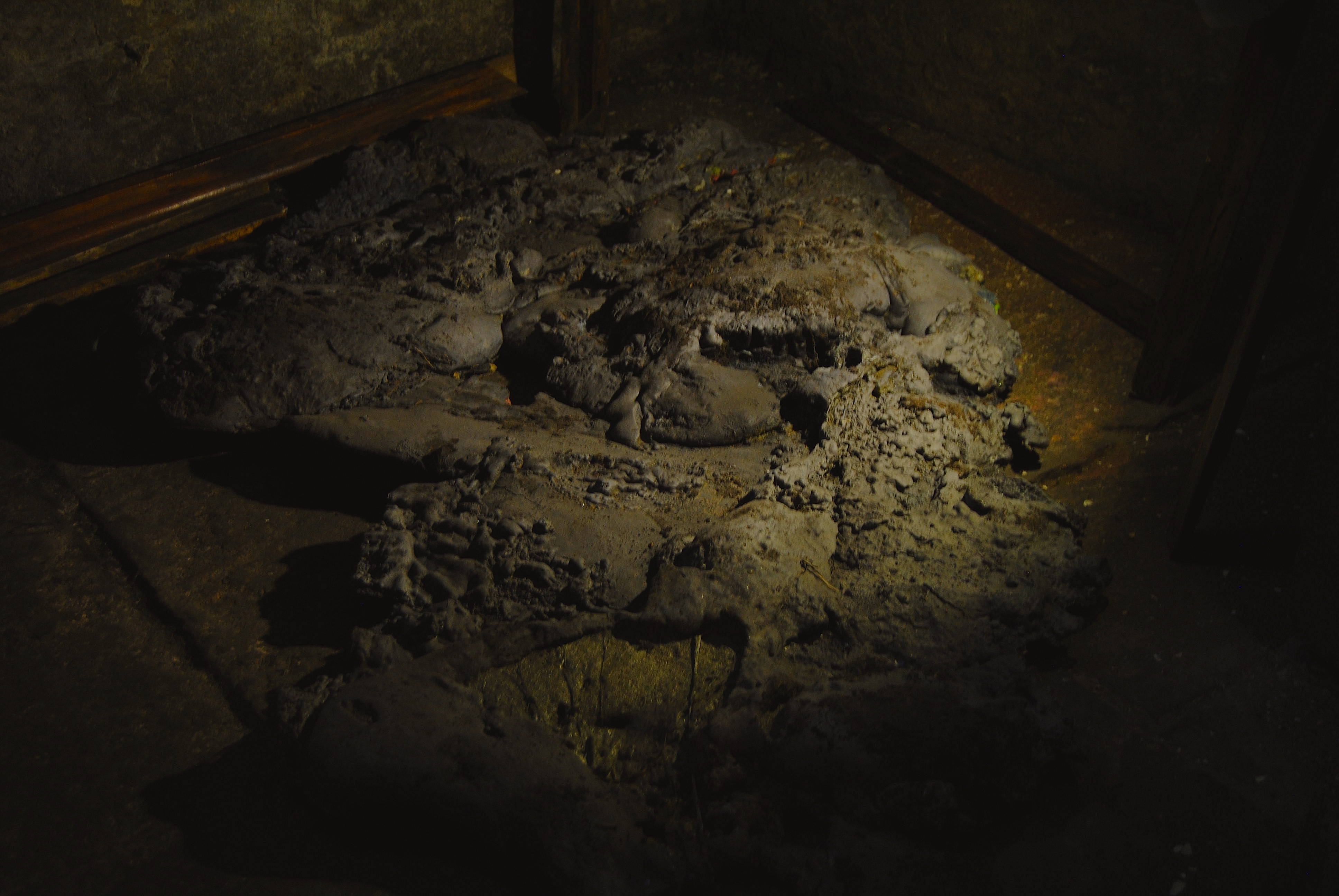 Samira Shafiei’s buried painting ‘The Unending Series’ transformed flat surface into sculptural installation through the decay process. Originally the largest work in the collection, the canvas was buried at the bottom of the demarcated plot. A projection showed some images of the original work against a brick wall, which effectively juxtaposed the materiality of the wall against the spotlit sculpture. The decomposed grey mass of canvas and paint, littered with broken bits of frame, took on a new life reminiscent of 1960s anti-form sculpture.
