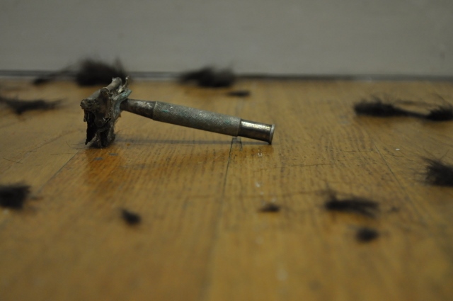 The residency will culminate in a performance on the 9th of May, which Robertson intends to be sound-based and will feature at least some improvisational elements. Her previous performances have often been visceral and multi-sensory, such as It’s My Birthday and I’ll Cry if I Want to, whereby artist and audience were brought to tears by a chemical reaction, and the bittersweet melancholy of birthdays was laid bare. Robertson’s current experiments invoke her chosen themes through abstract gestures; the act of shaving is amplified and grows monstrous with the use of blades and saws alongside shavers, whilst disembodied hair appears as a dead thing. Yet, the gentle and vulnerable act of singing contradicts such violent imagery, and it remains unclear whether the risk will pay off.