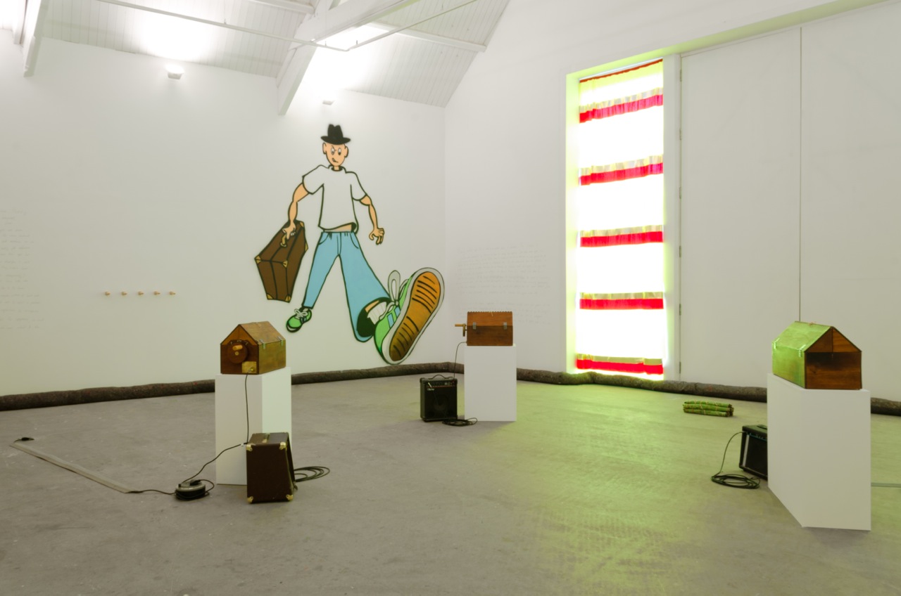 The middle floor space is held by Joseph Lewis’s Positiv Churches 1 to 3, and crossed by Stefan Sadlers’s in your house. Positiv churches 1 to 3 are three mahogany hurdy gurdys, each operated by a turn wheel and plugged into an amplifier.Their innards, whose string workings are traditionally on display, are concealed under collapsable pitched roofs. These beautiful inside out instrument-houses play aggressive noise, much louder than their size would suggest them capable of. They are both enigmatic and unnerving. Sadler’s work is comprised of the front and back view of a giant spray-painted jerk, who aggressively throws his weight from one wall to the other. His confidence is continual, even when you realise that he has (unbeknownst to him) trodden in a piece of chewing gum. The walls also play host to David Steans’ short horror story,The Swumps; three stanzas of which are scrawled on adjacent walls with graphite pencil. They begin with a medically accurate account of a stroke and continue to narrate the wall-pages through death and limbo.