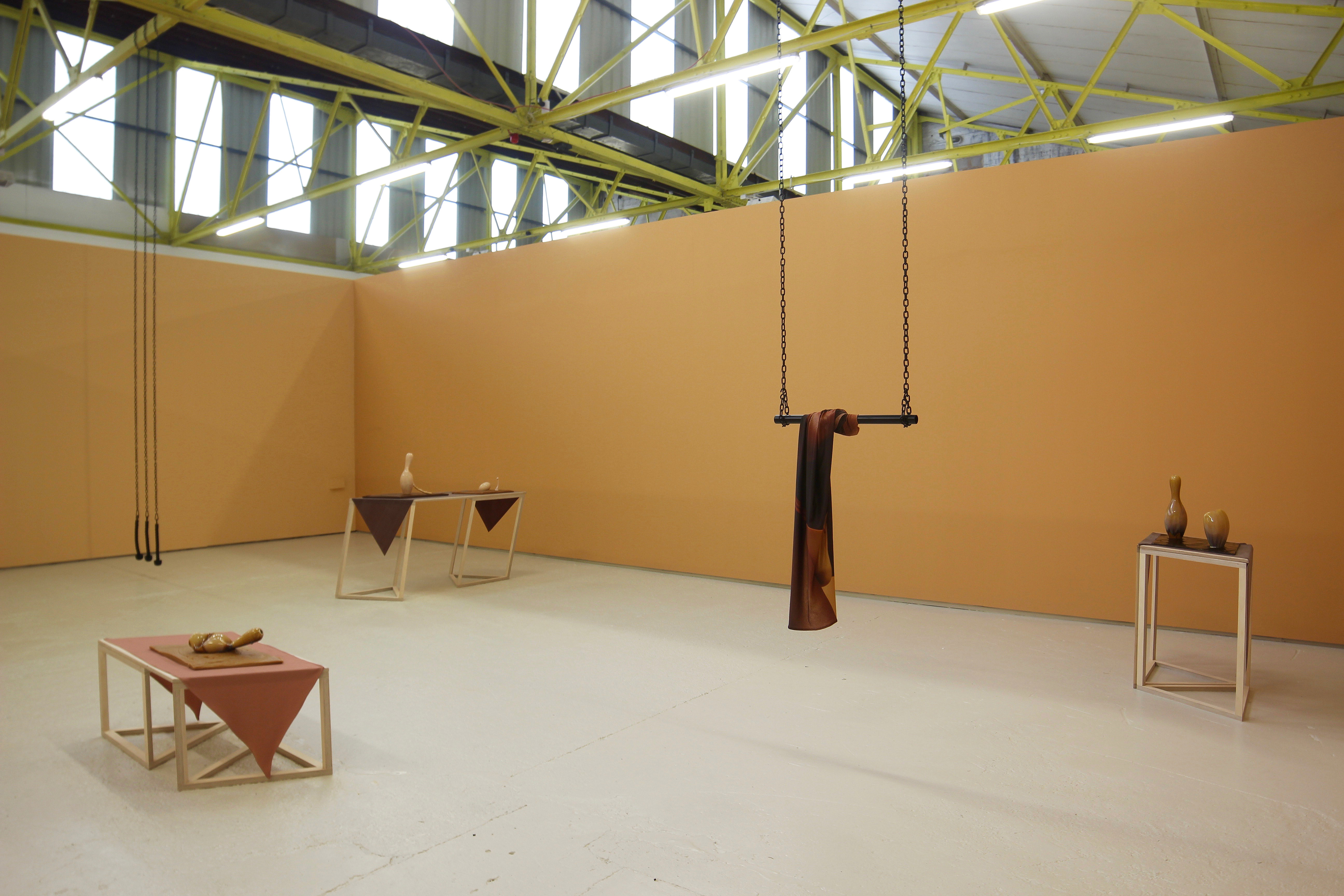 Dotted between the plinths, Ounstead’s black metal bars hang from the ceiling from black metal chains, evoking both gym equipment and BDSM gear. Draped from the bars are sheets of Lycra printed with close up images of the sculpted muscles of body builders. The gallery walls are painted tan, corresponding with the Lycra prints, and the overall effect is that of a set for a photo shoot awaiting the arrival of the models.