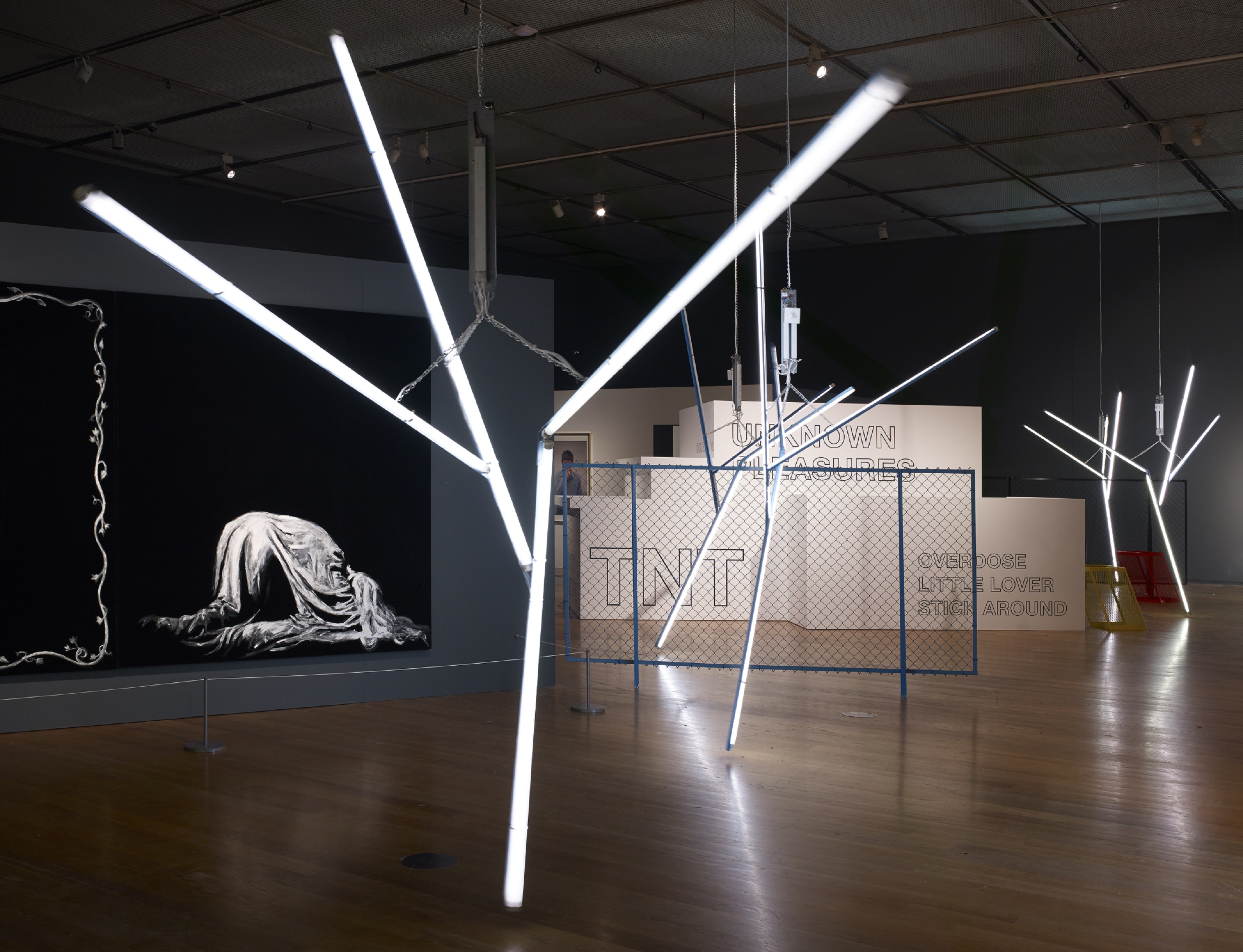 Although on the surface the exhibition is a celebration of two of Manchester’s most important bands, some of the more traditionally contemporary works pay homage to Curtis’ tragic suicide by hanging, such as ‘Ian Curtis’ (2001) by Dexter Dalwood, a dark oil on canvas painting of a lone hanging lightbulb in a shadowed room, depicting a bright light surrounded by a dark environment with nothing but a music speaker for company.