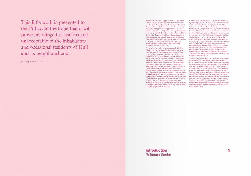 Occasional Residents is a collection of essays produced during Corridor8’s third residency programme, in partnership with Humber Street Gallery in Hull and inspired by the Substance programme (November/ December 2017) and the wider events and interventions of Hull UK City of Culture.