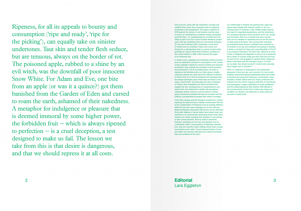 RIPE is a collection of essays produced during Corridor8’s first residency programme, in partnership with The Tetley in Leeds and broadly responding to two exhibitions that ran concurrently between 22 July and 9 October 2016: Polyculture, a solo show of recent work by artist Jonathan Trayte exploring food production and capitalist consumerism; and Lovers and Romances, a retrospective look at the censorship trial sparked by an exhibition of paintings by Stass Paraskos at the Leeds Institute in 1966.