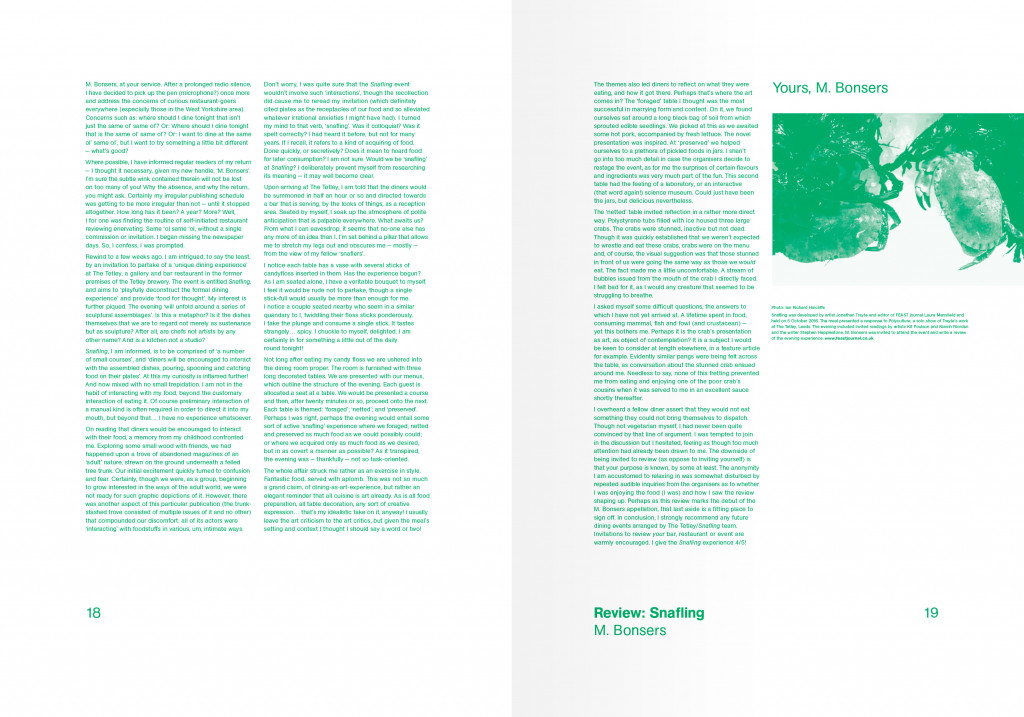 The publication includes an editorial by Lara Eggleton and essays by writer-in-residence Abi Mitchell, established writers Sally O’Reilly and Colin Perry, a review of an art/culinary event ‘Snafling’ (hosted by FEAST journal at The Tetley on 5 October 2016) by the Leeds based food critic M. Bonsers, and a limited-edition bespoke insert by artist Jonathan Trayte using international food packaging.